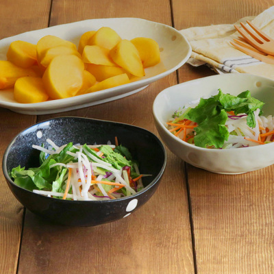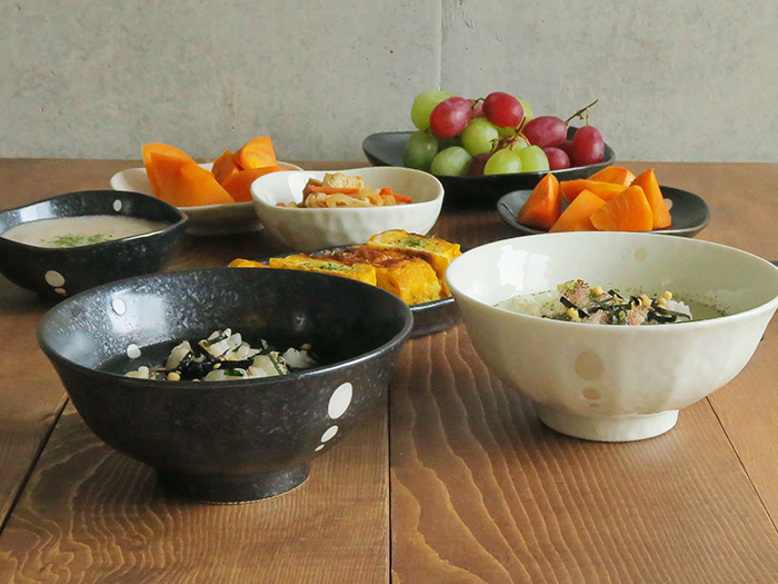 和食器らしいぽってりとした質感と、さりげない水玉のアクセントが可愛らしく、大人っぽい雰囲気ながらもどこか愛嬌のあるデザインです。