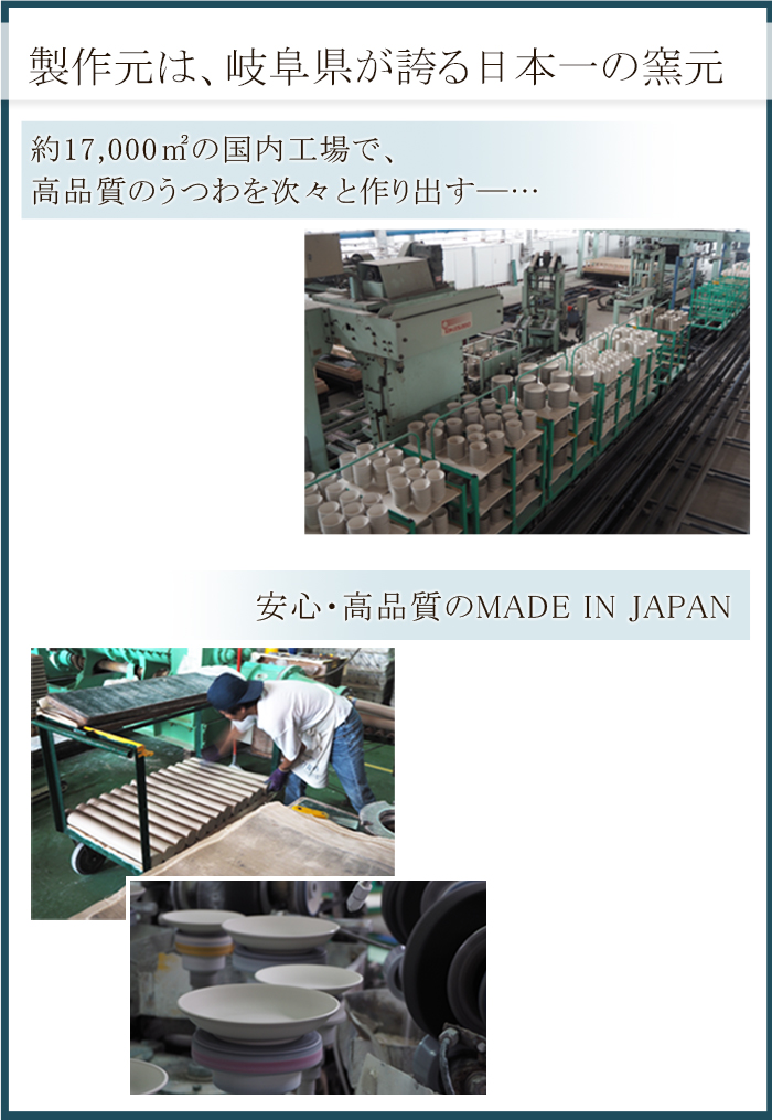 徹底管理された技術のもと、安定、安心、安全の商品提供。形状、素材、加飾に富んだ、圧倒的な多種展開です。