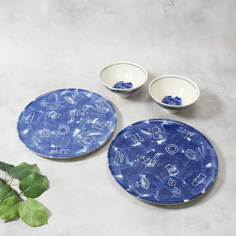さまざまな器が描かれた、遊び心のある器は並べるだけで食卓が華やぎます。