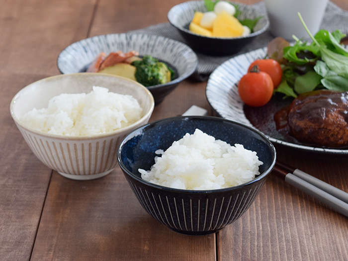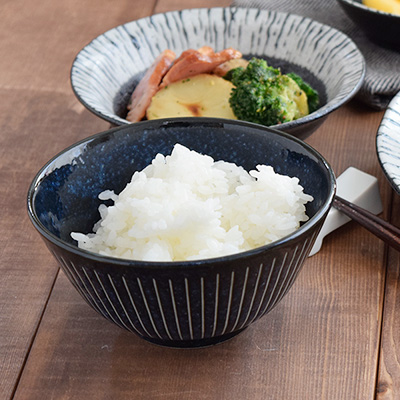 濃いブルーと薄いブルーが複雑に混じり合った、落ち着きのあるネイビーカラー。白米の色が引き立ち、色艶よく見せてくれます。
