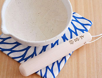 粉引のような模様でマットな質感の白唐津のすり鉢と、丈夫な檜製のすりこぎをセットにしました。