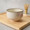 柔らかな白い粉引の風合いに、桜が手書きされたさわやかなデザインの抹茶椀です。