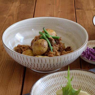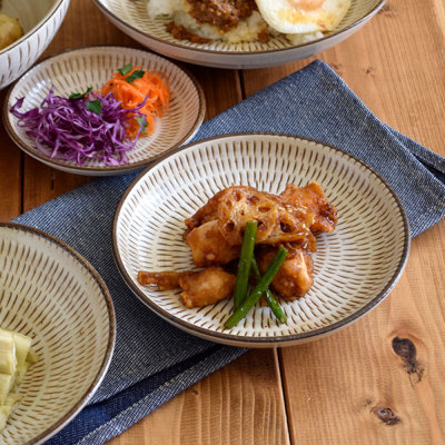 本来、この「かんな削り」を得意とする小鹿田焼や小石原焼はこの模様を一つ一つ手作業で行い、素地も土から作る陶器製が主ですが、それを大量生産の技術が優れた美濃焼が造ると、普段使いに取り入れやすい価格でしかも取り扱いが楽な磁器製で製作する事が出来、手軽に民芸食器の雰囲気を味わうことができます。