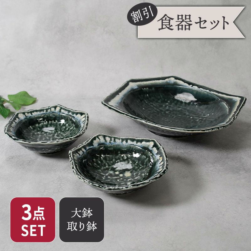 他の画像を見る 変形型で深みのあるカラーが食卓の主役になってくれる、大鉢&取り鉢の3点セット 大鉢 & 取り鉢 合計3点セット 黒部 ちぎり型 和食器 割引セット 送料無料 当店特別価格 ¥ 5,500 税込 カートに入れる お気に入りに登録する