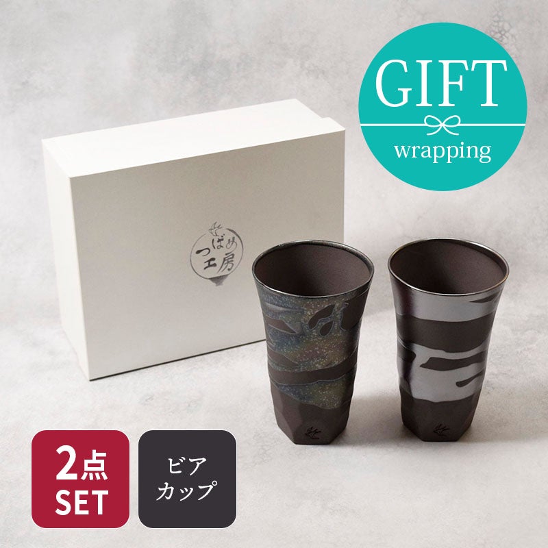 【有料ラッピング対象商品】味わいのある大人のビアカップ 陶製ビアカップ 435cc ペアセット ガーネット×メタリック 箱入り