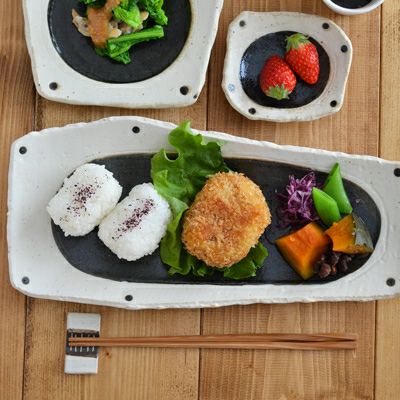 こちらは約32.5cmの細長いお皿で、写真のようにおにぎりとおかずをワンプレートに盛り付けたり、