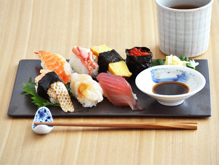 シルバーがかった黒に細かい結晶の粒が散らばっており複雑な色合い。和風味のある雰囲気なので、お寿司やお刺身ともよく合います。