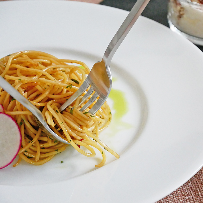 写真のようにパスタを食べたり、ディナー・ランチとどんなメニューにも対応できるカトラリーセットです。