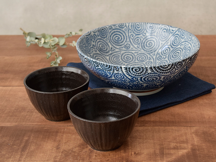 こちらは2人でそうめんを楽しむ際に使いたい食器のセットです。藍染のブルーと和食器の渋さの黒が大人の粋な食卓にオススメな和食器。