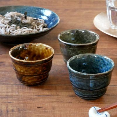 何気ない和食をおしゃれにみせてくれる、渋みある3色のそばちょこ。 ヒビを装飾として用いた貫入という技法を使った器です。万能食器といわれるそば猪口は、つゆ入れ以外にも小鉢や湯み代わりとし使ったり、デザートカップ、スープカップとしてもおすすめ。