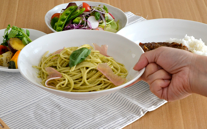 手造りの温かみを出しています。そのため、和食器と合わせても違和感なく、和食・洋食問わず使える万能な