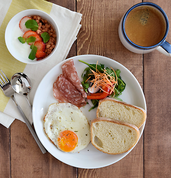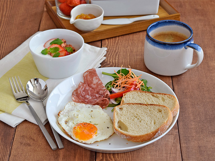 パン、目玉焼き、ハム、サラダを乗せれば、朝食のワンプレートにぴったり。 プレート部分は平らなので味が混ざったりすることもなく、こぼれないので綺麗にまとまります。