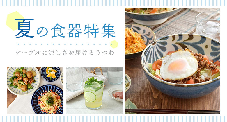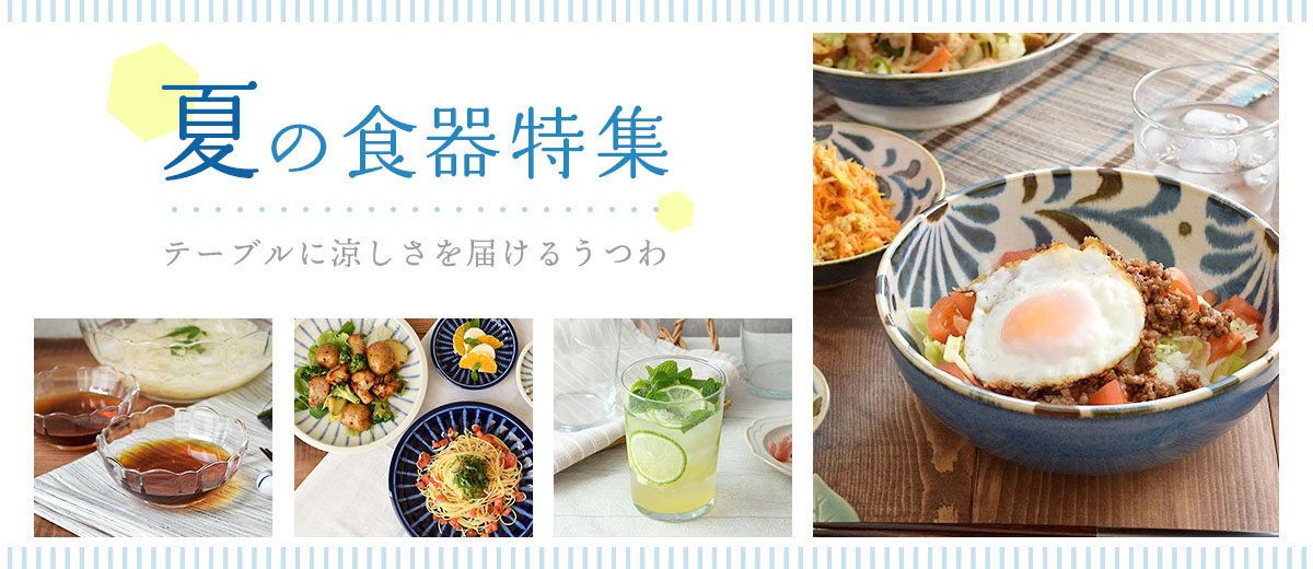 涼しげなガラス素材、海や空を思わせるブルー… 冷たい料理やドリンク・デザートがよく映える、 目にも涼しいうつわたちをご紹介します。