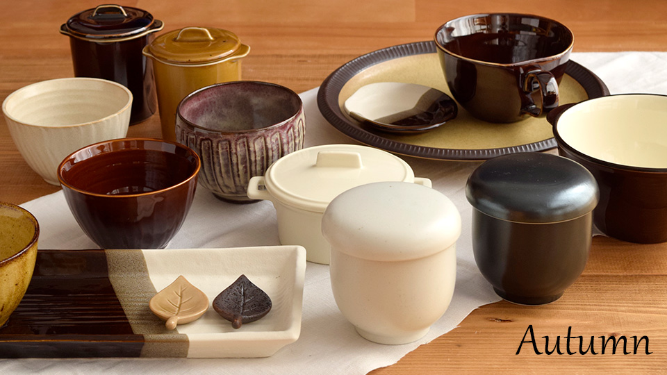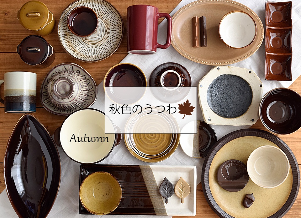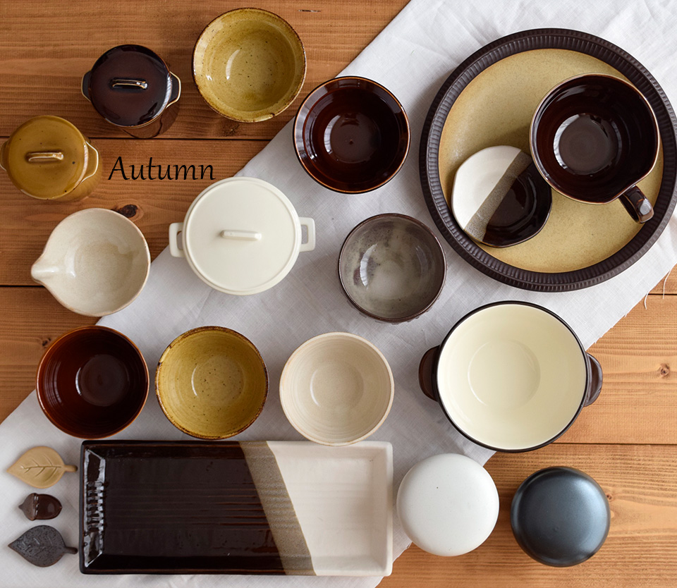 ベージュ・茶色・オレンジ・ワインレッドなど秋のイメージカラーの器を厳選。秋色の器を使うだけで食卓が秋っぽくなります。