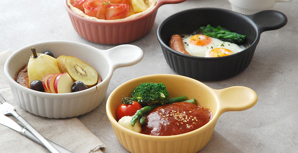 可愛いサイズの持ち手付きミニグラタン皿。 モーニングにグラタンや目玉焼きなどを入れても良いですし、ティータイムにプリンや焼き菓子を作るのも良いですね♪