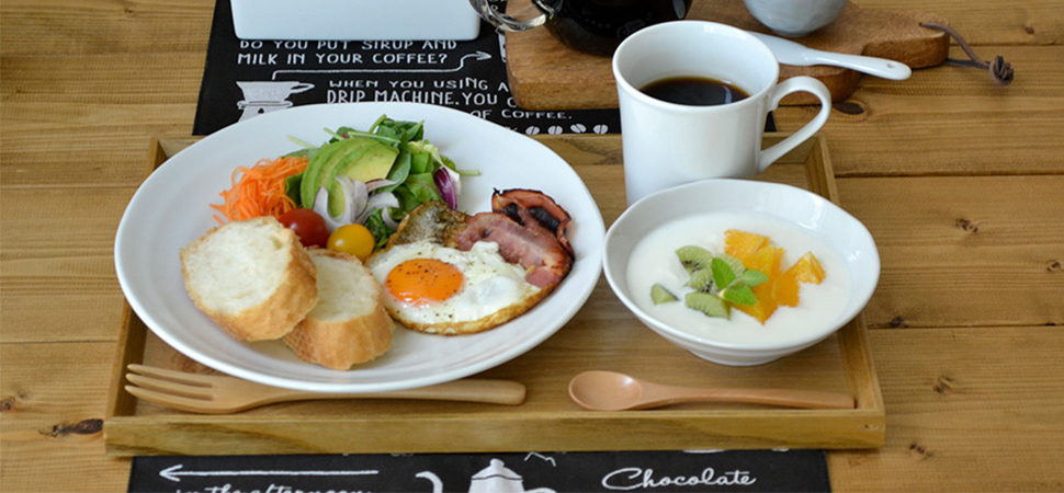 トレーの上に乗せば、おしゃれなカフェ風の食卓コーデに♪