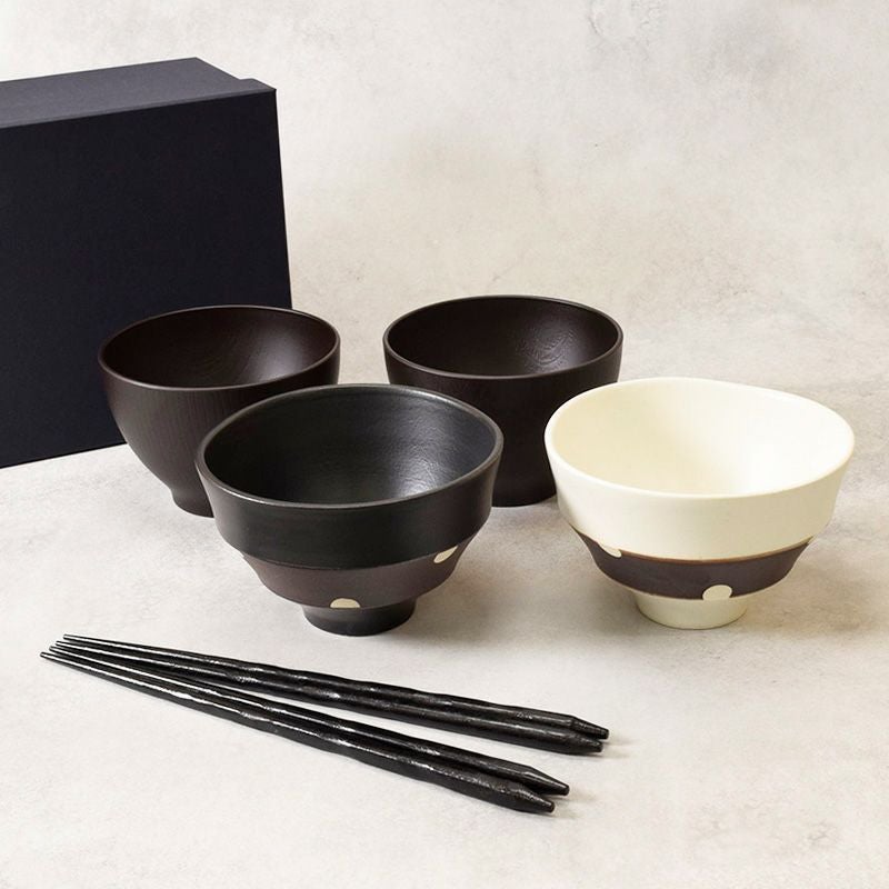 電子レンジ・食洗器OK!ご飯茶碗もスープボウルもボウル型で、ご飯からスープ、小鉢としてなど、多用途に使えるのが特徴。お箸もセットで届いてすぐ使えます。