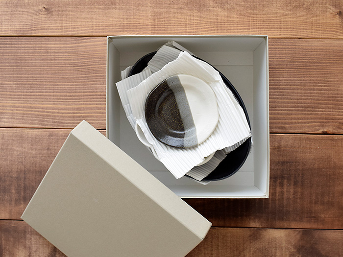 箱やパッケージに入れて、ラッピング(紙帯・リボン等)をしてお届けします。
