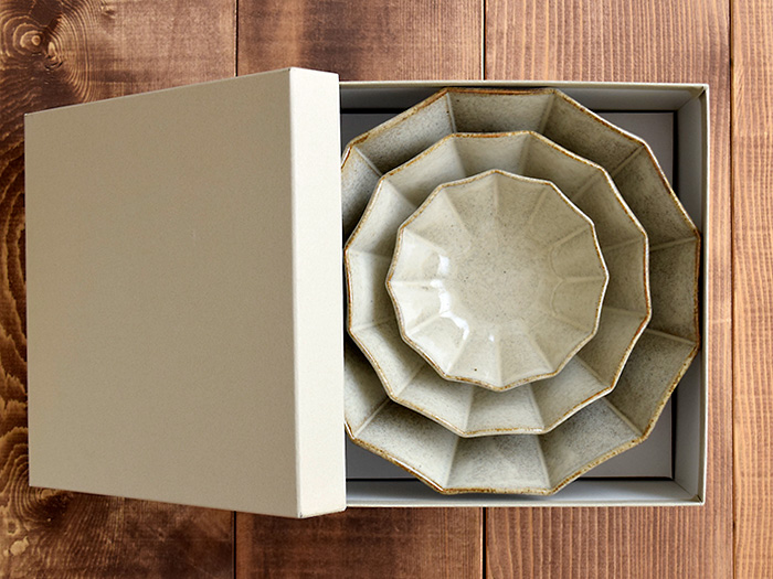 当店大人気の「しのぎ お花のリムプレート」のお皿3色をセットにしてギフトボックスへ入れたセット。