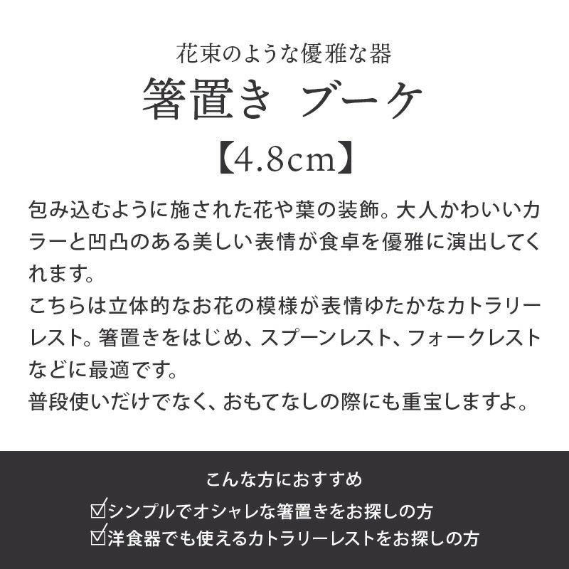他の画像を見る 【最大50%OFFセール】特別感のある優雅な洋食器。 在庫限り 箸置き ブーケ 定価 ¥ 467 のところ 当店特別価格 ¥ 420 税込 販売期間 2026/03/03 20:00 〜 2026/03/11 9:59 カートに入れる お気に入りに登録する