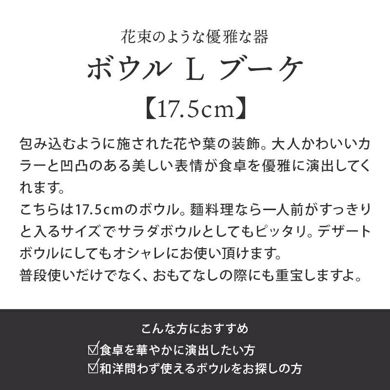 他の画像を見る 【30%値下げ】特別感のある優雅な洋食器。 在庫限り ボウル L 17.5cm ブーケ 定価 ¥ 1,380 のところ 当店特別価格 ¥ 965 税込 カートに入れる お気に入りに登録する
