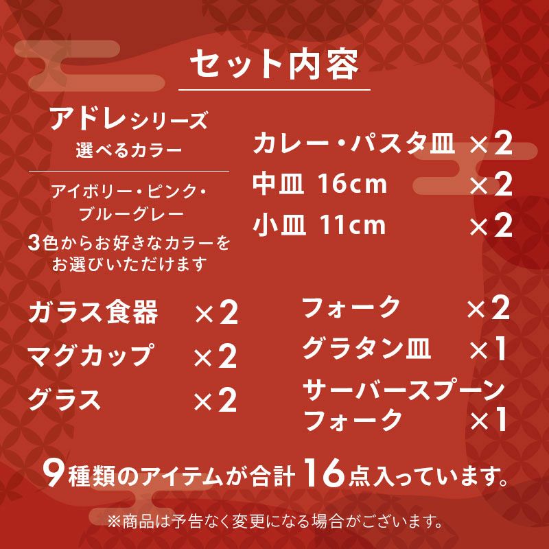 他の画像を見る 好みの色が選べる、おしゃれな福袋 2026年福袋 選べるカラー!アドレ食器16点セット 当店特別価格 ¥ 3,980 税込 販売期間 2025/12/03 20:00 〜 2026/03/31 23:59 カートに入れる お気に入りに登録する