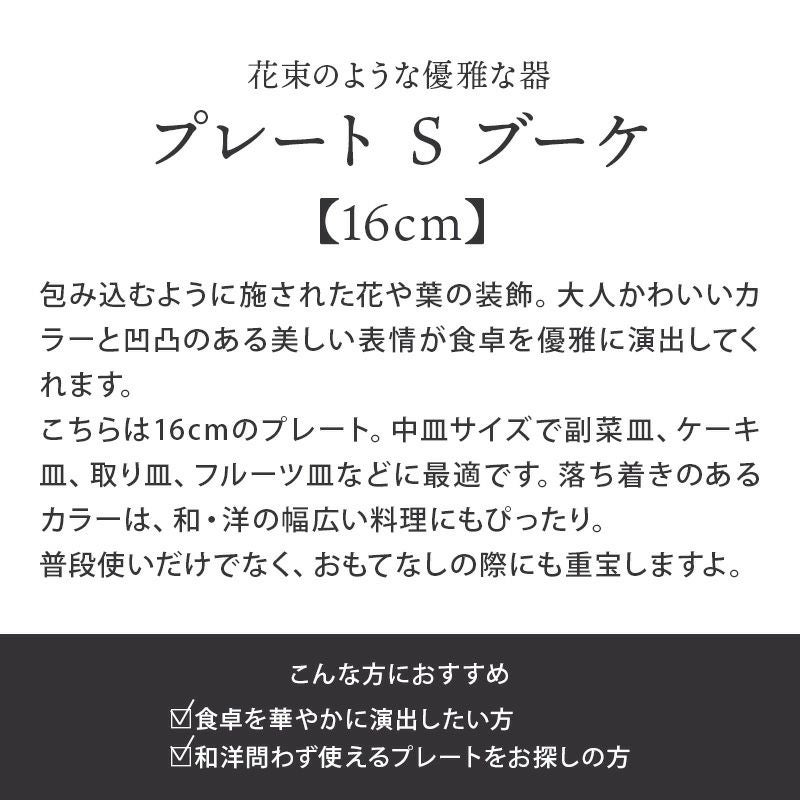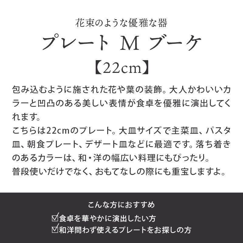 他の画像を見る 【30%値下げ】特別感のある優雅な洋食器。 在庫限り プレート M 22cm ブーケ 定価 ¥ 1,221 のところ 当店特別価格 ¥ 854 税込 カートに入れる お気に入りに登録する