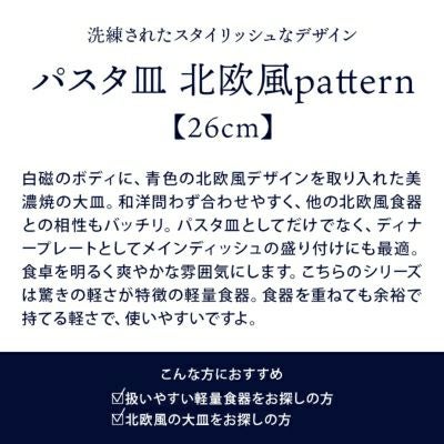 他の画像を見る 【最大50%OFFセール】食事がより楽しくなる、鮮やかな北欧柄食器 在庫限り パスタ皿 26cm 北欧風pattern 軽量食器 定価 ¥ 990 のところ 当店特別価格 ¥ 891 税込 販売期間 2026/03/03 20:00 〜 2026/03/11 9:59 カートに入れる お気に入りに登録する