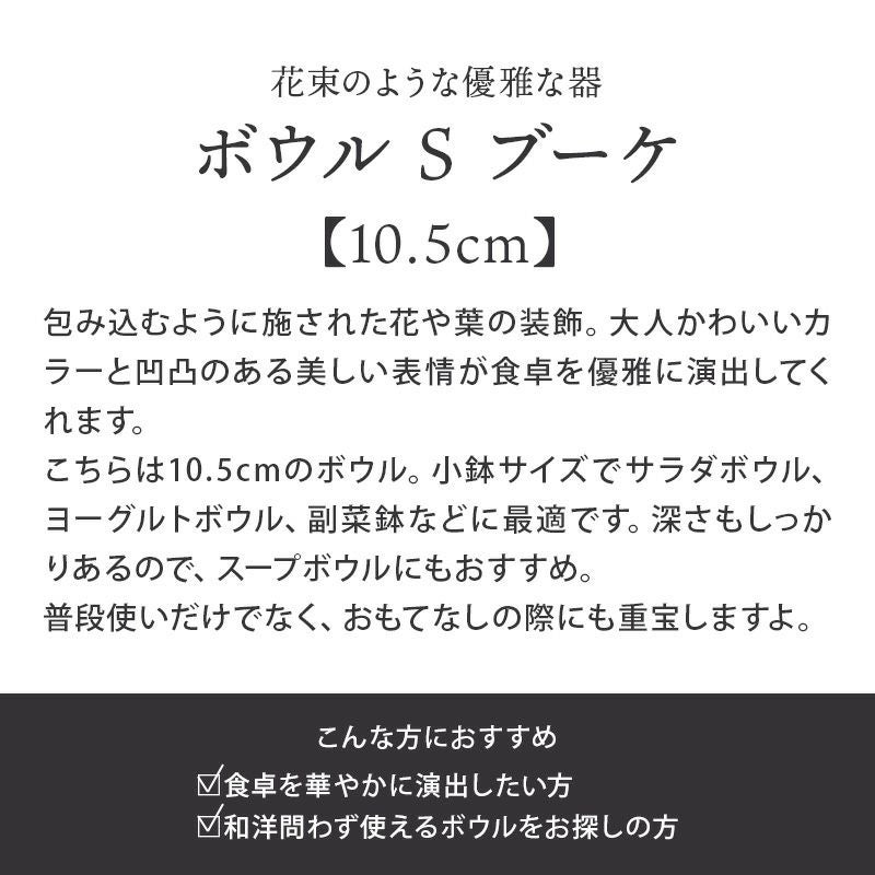 他の画像を見る 【30%値下げ】特別感のある優雅な洋食器。 在庫限り ボウル S 10.5cm ブーケ 定価 ¥ 530 のところ 当店特別価格 ¥ 370 税込 在庫切れ カートに入れる お気に入りに登録する