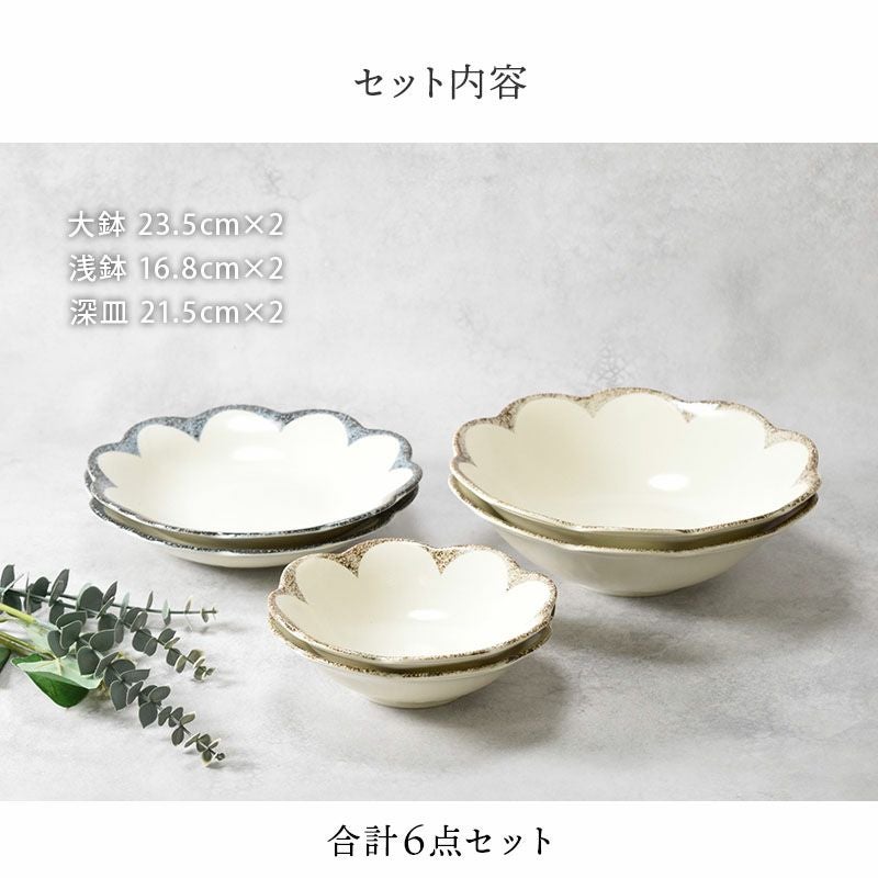 他の画像を見る 和・洋問わず使える花形の浅鉢・大鉢・深皿6点セット。 浅鉢・大鉢・深皿 6点セット 2人用 茉莉花 まつりか 花型 和食器 割引セット 送料無料 当店特別価格 ¥ 5,700 税込 在庫切れ 再入荷お知らせ お気に入りに登録する